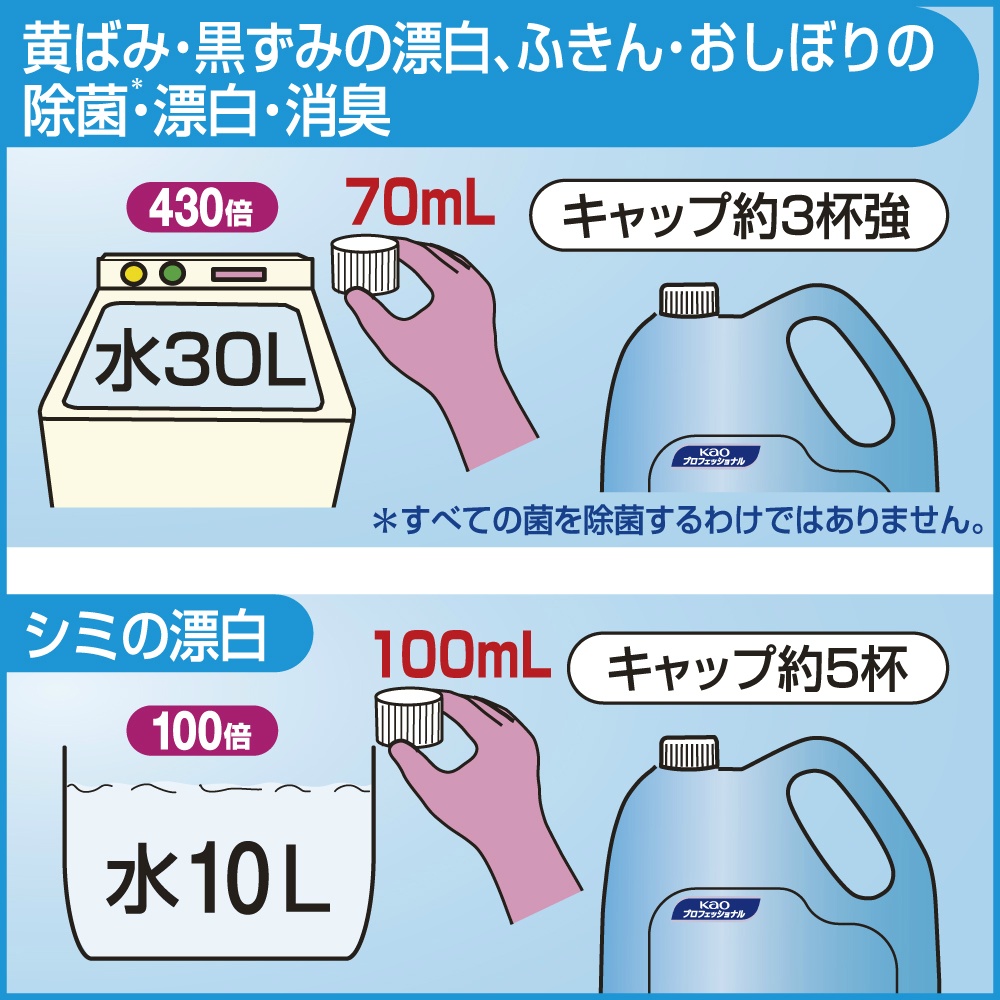| 注意事項 | 使用上の注意 ●用途外に使わない。 ●子供の手の届く所に置かない。 ●認知症の方などの誤飲や他の事故を防ぐため、置き場所に注意する。 ●原液で使わない。 ●熱湯で使わない。 ●作業時は保護メガネ、及び炊事用手袋を着用する。 ●キャップを開ける時に原液が飛び出るおそれがある。また容器を移動する時は、キャップをしっかり閉める。緩んでいると、液がはねて目や皮ふにつくおそれがある。 ●水や他のものを入れたり、他の容器につめかえたりしない。破裂することがある。 ●効果が落ちるので酸素系や還元系漂白 【使用方法用途など】用途 白物せんい用 (白物でも使えないものがあるので注意する。) ●黄ばみ・黒ずみの漂白 ●衣料の除菌・消臭 ●ふきん、おしぼりの除菌・漂白・消臭 ●食べ物、飲み物、血液、汗によるシミの漂白 使用量の目安 洗たく機洗い(水30 L)なら70 mL、洗いおけ(水5 L)なら12 mL 10 Lの水に100 mL 使い方 <洗たく機洗い> ●洗たく用洗剤といっしょに洗たく機に入れて洗う。(ステンレス槽可) <つけおき洗い> ●約30分浸し、水ですすぐ。 (生地 【使用上の注意】使用上の注意 ●用途外に使わない。 ●子供の手の届く所に置かない。 ●認知症の方などの誤飲や他の事故を防ぐため、置き場所に注意する。 ●原液で使わない。 ●熱湯で使わない。 ●作業時は保護メガネ、及び炊事用手袋を着用する。 ●キャップを開ける時に原液が飛び出るおそれがある。また容器を移動する時は、キャップをしっかり閉める。緩んでいると、液がはねて目や皮ふにつくおそれがある。 ●水や他のものを入れたり、他の容器につめかえたりしない。破裂することがある。 ●効果が落ちるので酸素系や還元系漂白 |