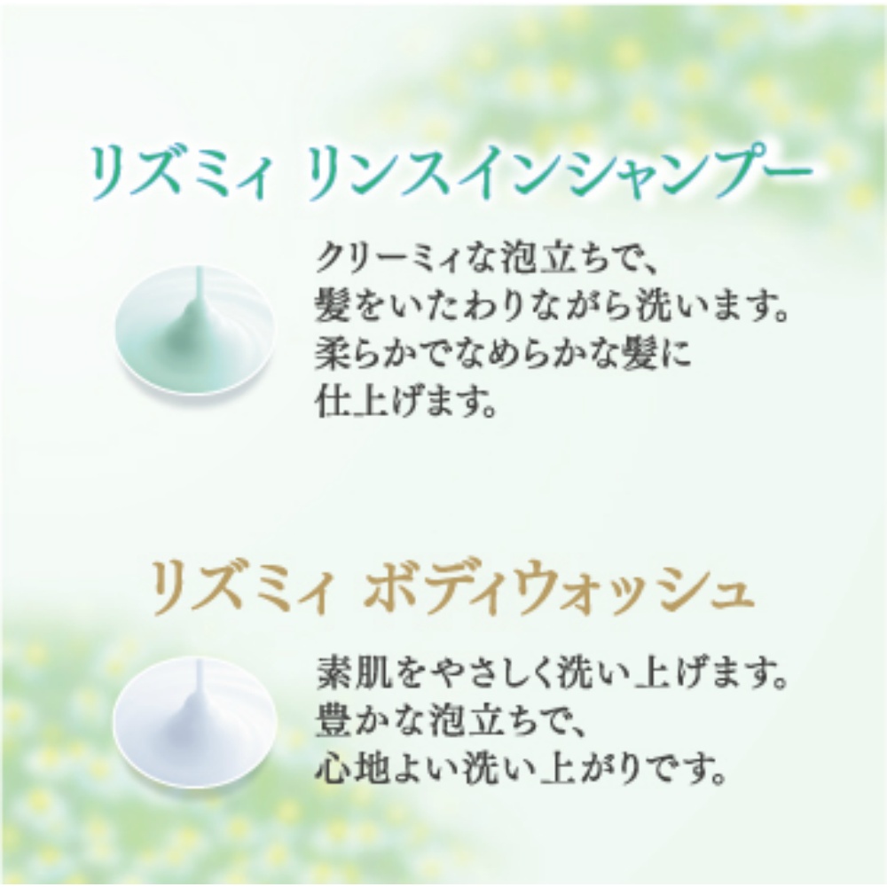 | 素材 | 【表示成分】成分:水、ラウレス硫酸Na、ジステアリン酸グリコール、ラウレス-16、ラウラミドプロピルベタイン、エタノール、ココアンホ酢酸Na、カミツレ花エキス、ポリクオタニウム-10、PEG/PPG-20/22ブチルエーテルジメチコン、ベヘントリモニウムクロリド、セテアリルアルコール、エトキシジグリコール、コカミドMEA、ラウレス-4、クエン酸、EDTA-3Na、水酸化Na、安息香酸Na、香料、黄4、緑3 |