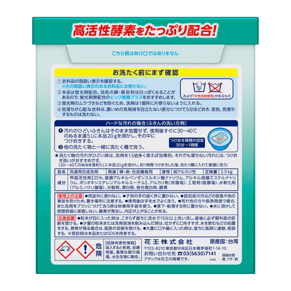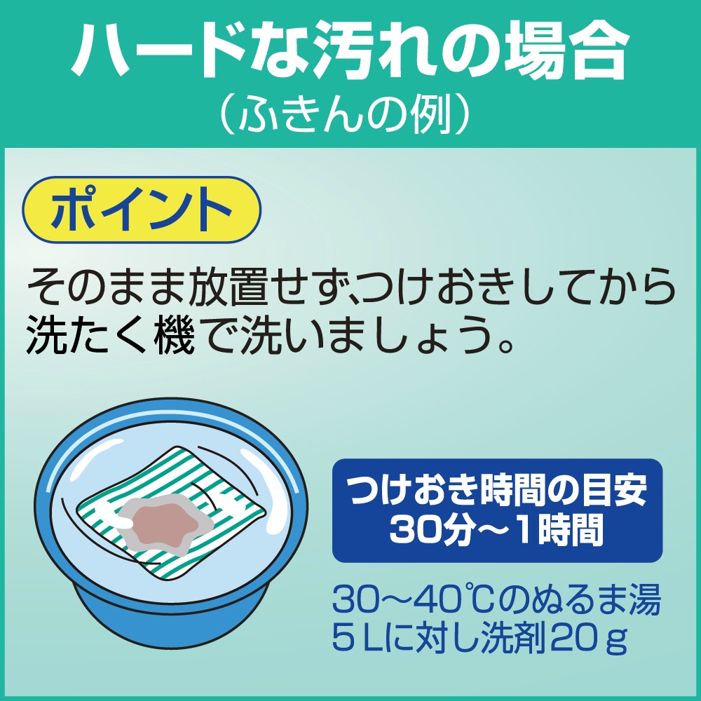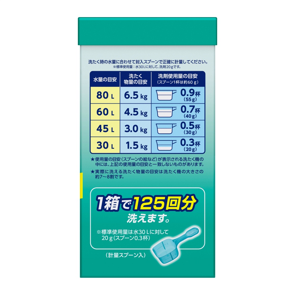 | 素材 | 【表示成分】●液性 弱アルカリ性 ●成分 界面活性剤【25%、直鎖アルキルベンゼンスルホン酸ナトリウム、アルキル硫酸エステルナトリウム、ポリオキシエチレンアルキルエーテル】、水軟化剤(アルミノけい酸塩)、アルカリ剤(炭酸塩)、分散剤、工程剤、漂白剤、蛍光増白剤、酵素 |