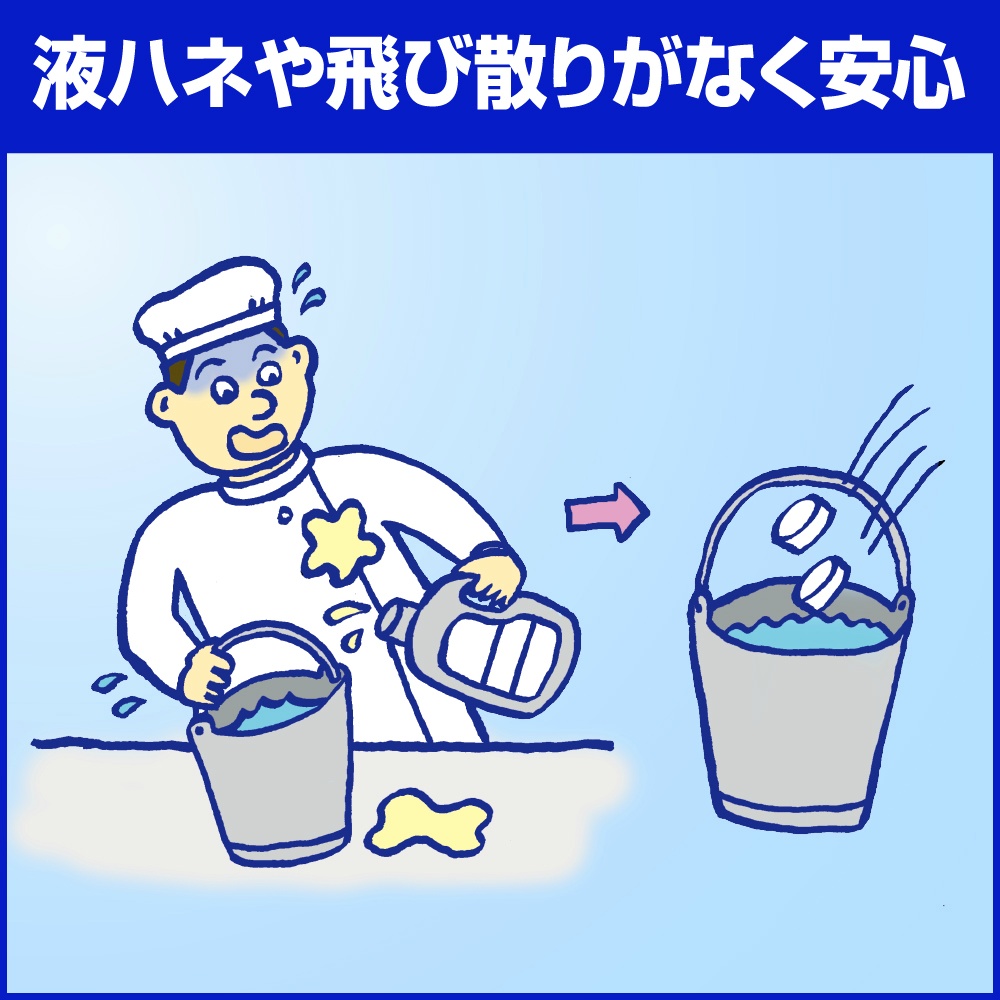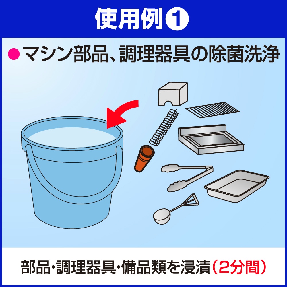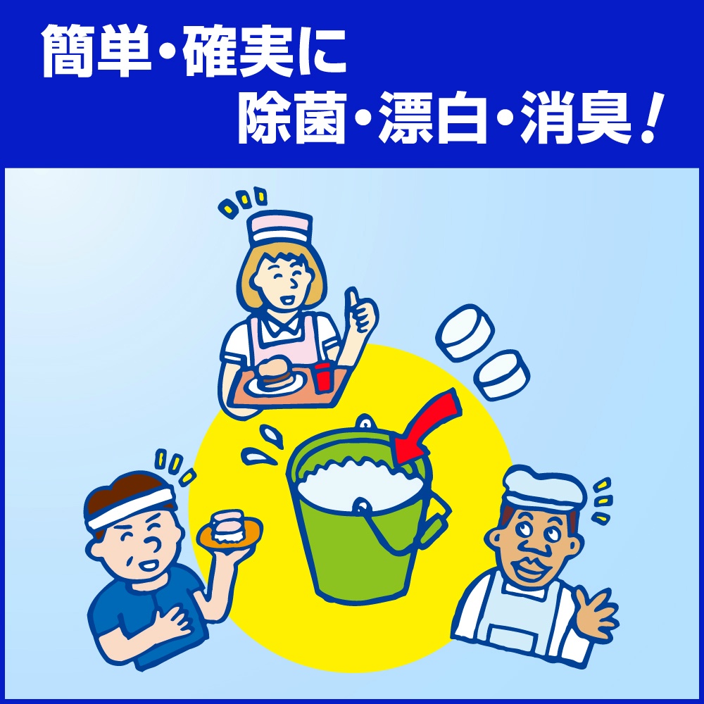 | 注意事項 | 使用上の注意 ●用途外に使わない。 ●子供の手の届く所に置かない。 ●認知症の方などの誤食や他の事故を防ぐため、置き場所・漂白中の食器などの取り扱いに注意する。 ●炊事用手袋を着用する。 ●熱湯で使わない。 ●つけおきする際は密閉しない。圧力が上がって容器が割れるおそれがある。 ●使用時は液が目に入ったり、皮ふにつかないように注意する。 ●他の洗浄剤と併用しない。 ●酸性タイプの製品や生ごみ・食酢・アルコールと混ざらないようにする。有害なガスが発生して危険。 ●衣類や敷物や家具に液がつ 【使用方法用途など】用途・使用量の目安 ●ソフトクリーム・シェイクの各マシン内部タンク、ラインなどの除菌 :8Lのお湯(40~50℃)に2錠/希釈液に約2分間浸すか、または浸すように拭き、使用後は水で充分にすすぐ。 ※使用前に各機器の洗浄マニュアルを確認する。 ●カウンタークロス、ダスター、ふきん、おしぼりの除菌・漂白・消臭 :5Lの水に2~3錠/約30分(汚れのひどい時は少し長めに)浸した後、水で充分すすぐ。 ※除菌のみの場合、約2分間浸した後、水で充分すすぐ。 ●食器(湯のみ、カップ)、調理 【使用上の注意】使用上の注意 ●用途外に使わない。 ●子供の手の届く所に置かない。 ●認知症の方などの誤食や他の事故を防ぐため、置き場所・漂白中の食器などの取り扱いに注意する。 ●炊事用手袋を着用する。 ●熱湯で使わない。 ●つけおきする際は密閉しない。圧力が上がって容器が割れるおそれがある。 ●使用時は液が目に入ったり、皮ふにつかないように注意する。 ●他の洗浄剤と併用しない。 ●酸性タイプの製品や生ごみ・食酢・アルコールと混ざらないようにする。有害なガスが発生して危険。 ●衣類や敷物や家具に液がつ |