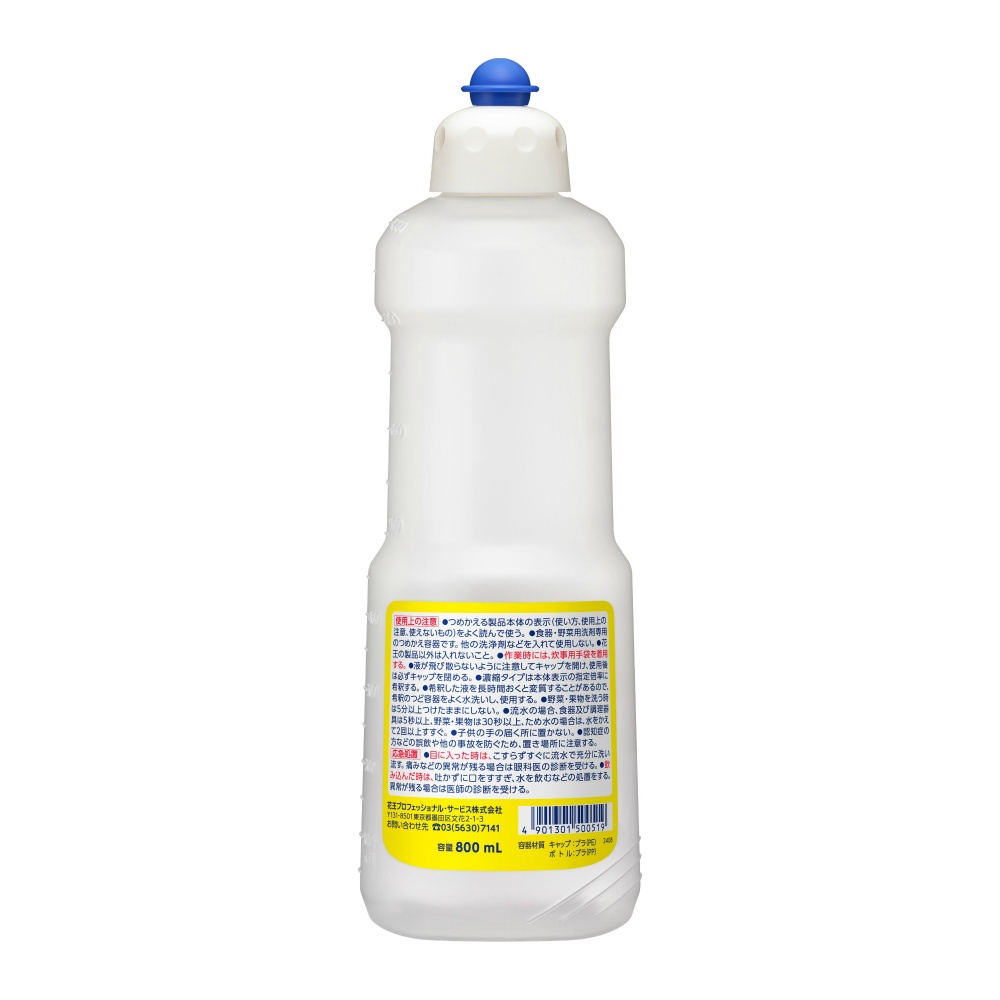 | 注意事項 | 使用上の注意 ●つめかえる製品本体の表示(使い方、使用上の注意、使えないもの)をよく読んで使う。 ●食器・野菜用洗剤専用のつめかえ容器です。他の洗浄剤などを入れて使用しない。 ●作業時には、炊事用手袋を着用する。 ●液が飛び散らないように注意してキャップを開け、使用後は必ずキャップを閉める。 ●濃縮タイプは本体表示の指定倍率に希釈する。 ●希釈した液を長時間おくと変質することがあるので、希釈のつど容器をよく水洗いし、使用する。 ●野菜・果物を洗う時は5分以上つけたままにしない。 ●流水の場 【使用方法用途など】本品は空容器です。 【希釈方法】 ・希釈する場合は、使用する希釈倍率の目盛線まで洗浄剤を入れる。 ・ぬるま湯または水を800mLの目盛線まで入れる。 ・キャップをしっかり閉め、必ずつまみを押し込み、よく振って混ぜる。 【使用上の注意】使用上の注意 ●つめかえる製品本体の表示(使い方、使用上の注意、使えないもの)をよく読んで使う。 ●食器・野菜用洗剤専用のつめかえ容器です。他の洗浄剤などを入れて使用しない。 ●作業時には、炊事用手袋を着用する。 ●液が飛び散らないように注意してキャップを開け、使用後は必ずキャップを閉める。 ●濃縮タイプは本体表示の指定倍率に希釈する。 ●希釈した液を長時間おくと変質することがあるので、希釈のつど容器をよく水洗いし、使用する。 ●野菜・果物を洗う時は5分以上つけたままにしない。 ●流水の場 |