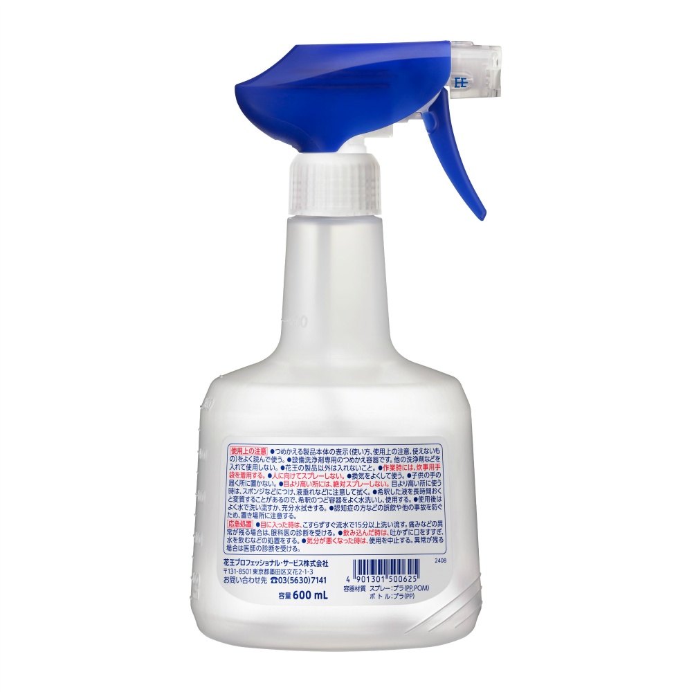 | 注意事項 | 使用上の注意 ●つめかえる製品本体の表示(使い方、使用上の注意、使えないもの)をよく読んで使う。 ●設備洗浄剤専用のつめかえ容器です。他の洗浄剤などを入れて使用しない。 ●人に向けてスプレーしない。 ●作業時には炊事用手袋を着用する。 ●目より高い所には、絶対スプレーしない。 ●目より高い所に使う時は、スポンジなどにつけ、液垂れなどに注意してふく。 ●希釈した液を長時間おくと変質することがあるので、希釈のつど容器をよく水洗いし、使用する。 ●使用後はよく水で洗い流すか、充分水ぶきをする。 【使用方法用途など】本品は空容器です。 以下の製品を入れてお使いください。 【ご使用の除菌洗浄剤例】 ・ ガラスマジックリン ・ マイペット ・ かんたんマイペット ・ トイレマジックリン消臭洗浄スプレー ・ バスマジックリン ・ バスマジックリン除菌消臭プラス ・ ホテルバスマジックリン 【希釈方法】 ・希釈する場合は、使用する希釈倍率の目盛線まで洗浄剤を入れる。 ・ぬるま湯または水を600mLの目盛線まで入れる。 ・キャップをしっかり閉め、よく振って混ぜる。 【ノズルの使い方】 【使用上の注意】使用上の注意 ●つめかえる製品本体の表示(使い方、使用上の注意、使えないもの)をよく読んで使う。 ●設備洗浄剤専用のつめかえ容器です。他の洗浄剤などを入れて使用しない。 ●人に向けてスプレーしない。 ●作業時には炊事用手袋を着用する。 ●目より高い所には、絶対スプレーしない。 ●目より高い所に使う時は、スポンジなどにつけ、液垂れなどに注意してふく。 ●希釈した液を長時間おくと変質することがあるので、希釈のつど容器をよく水洗いし、使用する。 ●使用後はよく水で洗い流すか、充分水ぶきをする。 |