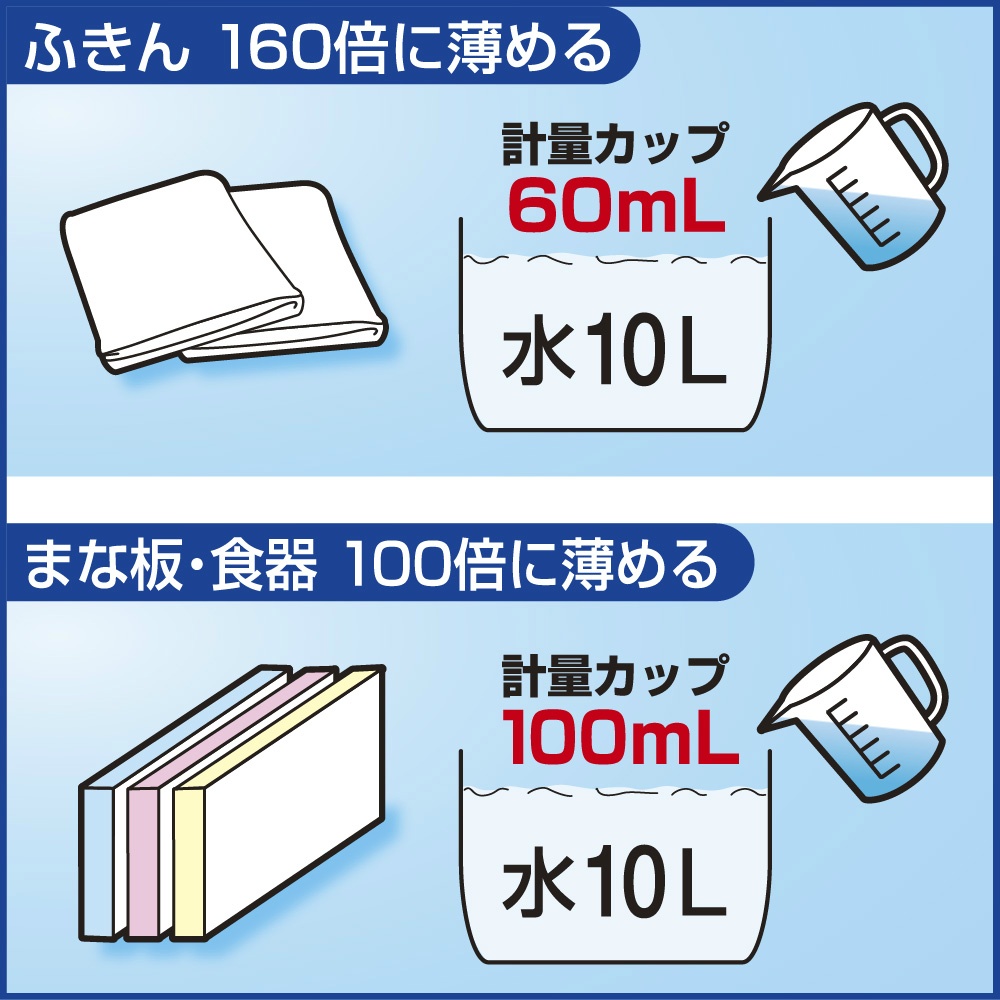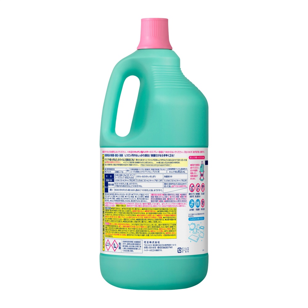 | 注意事項 | 使用上の注意 ●用途外に使わない。 ●子供の手の届く所に置かない。 ●認知症の方などの誤飲や他の事故を防ぐため、本品の置き場所・漂白中の食器などの取り扱いに注意する。 ●原液で使わない。 ●熱湯で使わない。 ●作業時は保護メガネ、及び炊事用手袋を着用する。 ●キャップを開ける時に原液が飛び出るおそれがある。また容器を移動する時は、キャップをしっかり閉める。緩んでいると、液がはねて目や皮ふにつくおそれがある。 ●他の洗剤などと併用しない。 ●酸性タイプの製品や塩素系の排水口 【使用方法用途など】用途 ●厨房用品の漂白・除菌・消臭 ・台所用洗剤では取れない、シミ、茶しぶ、くもり、黒ずみなどをきれいに落とします。 ・ふきんやまな板についている雑菌・悪臭もしっかり取り除きます。 ●ふきん、台ふきん、おしぼり 【漂白(除菌・消臭)】 約30分(汚れのひどい時には少し長めに)浸した後、水ですすぐ。 【除菌(消臭)】 約2分浸した後、水ですすぐ。 使用量の目安 10 Lの水に60 mL ●まな板、食器(茶碗、カップ、ほ乳びんなど)、きゅうす 【漂白(除菌・消臭)】 約30分( 【使用上の注意】使用上の注意 ●用途外に使わない。 ●子供の手の届く所に置かない。 ●認知症の方などの誤飲や他の事故を防ぐため、本品の置き場所・漂白中の食器などの取り扱いに注意する。 ●原液で使わない。 ●熱湯で使わない。 ●作業時は保護メガネ、及び炊事用手袋を着用する。 ●キャップを開ける時に原液が飛び出るおそれがある。また容器を移動する時は、キャップをしっかり閉める。緩んでいると、液がはねて目や皮ふにつくおそれがある。 ●他の洗剤などと併用しない。 ●酸性タイプの製品や塩素系の排水口 |
