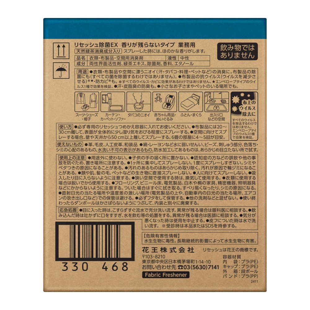 | 注意事項 | 使用上の注意 ●用途外に使わない。●子供の手の届く所に置かない。●認知症の方などの誤飲や他の事故を防ぐため、置き場所に注意する。●1ヶ所に集中してスプレーしない。1度にスプレーしすぎない。シミやベタつきの原因になることがある。●汚れのあるものはあらかじめ取り除く。汚れが原因で輪ジミになることがある。●顔や肌、髪の毛、ペットなどの生き物に直接スプレーしない。●人に向けてスプレーしない。●吸入したり目に入らないように注意する。●狭い空間で使用する時は、換気して使用する。●衣類に使用する場合は脱いでから使用す 【使用方法用途など】用途 衣類・布製品や空間に漂うニオイ(汗・タバコ・料理・ペットなど)の消臭に。 布製品の除菌にも。*すべての菌を除菌するわけではありません。布上での効果。 使い方 ●必ず専用のリセッシュつめかえ容器に入れてお使いください。●布製品には20~30cm離して、 表面が全体的に少し湿り気をおびる程度にスプレーする。●空間に向けてスプレーする場合、壁や天井 から50cm以上離してスプレーする。6畳の部屋に4~5回が目安。 使えないもの ●革、毛皮、人工皮革、和装品 ●絹、レーヨンなど水に弱 【使用上の注意】使用上の注意 ●用途外に使わない。●子供の手の届く所に置かない。●認知症の方などの誤飲や他の事故を防ぐため、置き場所に注意する。●1ヶ所に集中してスプレーしない。1度にスプレーしすぎない。シミやベタつきの原因になることがある。●汚れのあるものはあらかじめ取り除く。汚れが原因で輪ジミになることがある。●顔や肌、髪の毛、ペットなどの生き物に直接スプレーしない。●人に向けてスプレーしない。●吸入したり目に入らないように注意する。●狭い空間で使用する時は、換気して使用する。●衣類に使用する場合は脱いでから使用す |