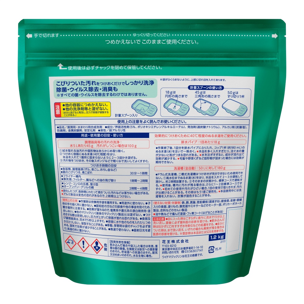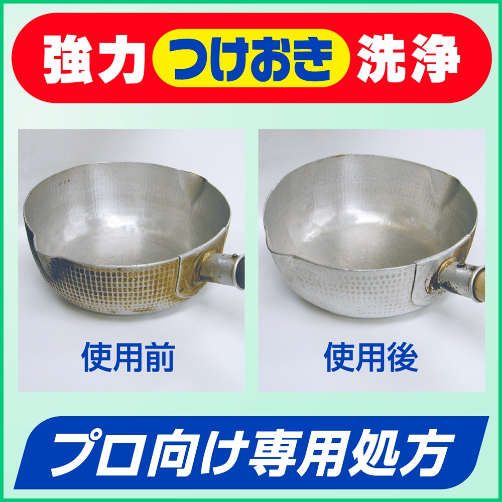 | 注意事項 | 使用上の注意 ●作業時は炊事用手袋を着用する。 ●用途外に使わない。 ●子供の手の届く所に置かない。 ●効果が落ちるので、塩素系や還元系の漂白剤と併用・混合しない。 ●家庭用のワイドマジックリン及び他のマジックリン(液体のマジックリン製品)とはまぜない。 ●つけおきする際は密閉しない。圧力が上がって容器が割れる恐れがある。 ●食器及び調理器具は、流水で5秒以上すすぐ。 ●容器に水や他のものを入れたり、詰替えたりしない。破裂することがある。 ●移動、保管時は容器のキャップを必ず閉める。湿気 【使用方法用途など】用途・使用量の目安・使い方 効果的につけおくために40℃程度のぬるま湯をご使用下さい。 【調理器具等の汚れの洗浄:水10Lあたり90g】(キャップ1杯は約15g) 拭き取れる油汚れや固形物はあらかじめ取り除く。 つけおく容器にぬるま湯(水)をはり、本品を入れて1箇所に固まらないように2~3回かきまぜる。 汚れ物をつけおき、その後スポンジなどで軽くなで洗いしてよくすすぐ。 つけおき時間の目安 30分~1時間 ●食器類、調理器具(ザル、茶こし、おろし金など) ●鍋のこびりつき、煮こぼれ 【使用上の注意】使用上の注意 ●作業時は炊事用手袋を着用する。 ●用途外に使わない。 ●子供の手の届く所に置かない。 ●効果が落ちるので、塩素系や還元系の漂白剤と併用・混合しない。 ●家庭用のワイドマジックリン及び他のマジックリン(液体のマジックリン製品)とはまぜない。 ●つけおきする際は密閉しない。圧力が上がって容器が割れる恐れがある。 ●食器及び調理器具は、流水で5秒以上すすぐ。 ●容器に水や他のものを入れたり、詰替えたりしない。破裂することがある。 ●移動、保管時は容器のキャップを必ず閉める。湿気 |