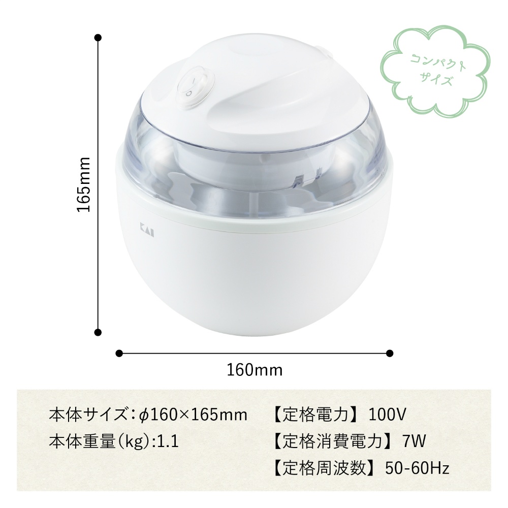 | 注意事項 | 本来の目的以外に使用しないでください。 【使用方法用途など】冷凍庫で凍らせたポットが、冷たいアイスクリームを作ります。\n冷凍庫に収納しやすい大きさです。\n12時間以上、冷却して使用して下さい。 【使用上の注意】本来の目的以外に使用しないでください。 【保管保存方法】乳幼児の手が届かない安全な場所に保管してください。 |