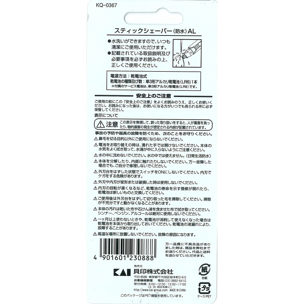 | 注意事項 | 鼻毛を切る目的以外には使用しないでください。 【使用方法用途など】特になし 【使用上の注意】鼻毛を切る目的以外には使用しないでください。 【保管保存方法】ご使用後は外刃をはずして切り取った毛を掃除してください。掃除が不十分ですと動かなくなることがあります。 |