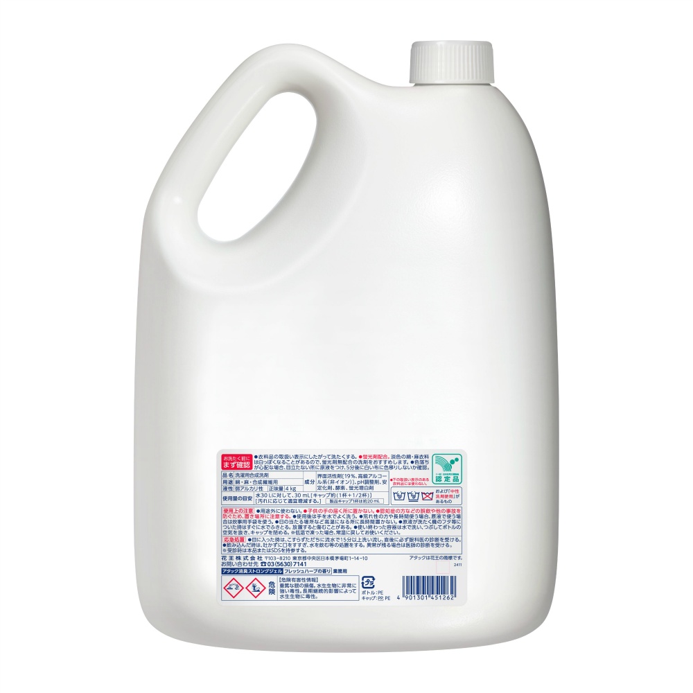 | 素材 | 【表示成分】界面活性剤[19%、高級アルコール系(非イオン)]、pH調整剤、安定化剤、酵素、蛍光増白剤 |