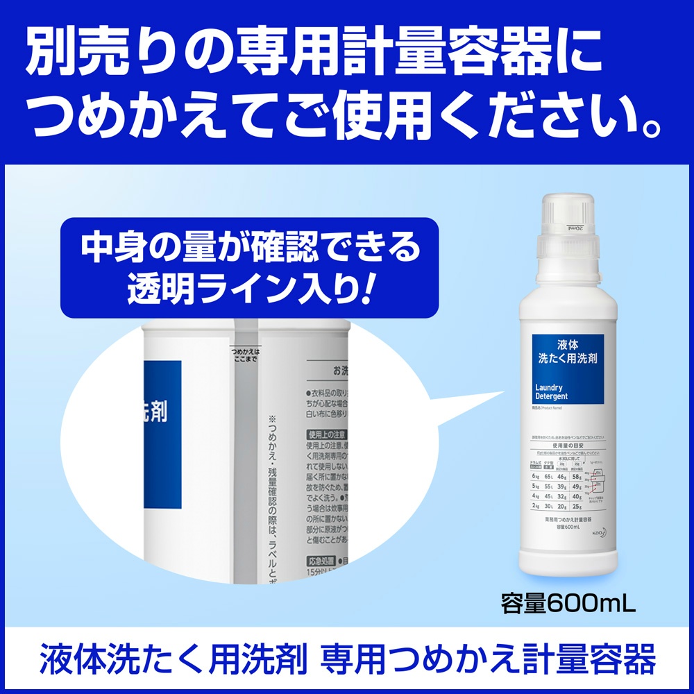 | 注意事項 | 〔使用上の注意〕 ●用途外に使わない。 ●子供の手の届く所に置かない。 ●認知症の方などの誤飲や他の事故を防ぐため、置き場所に注意する。 ●使用後は手を水でよく洗う。 ●荒れ性の方や長時間使う場合、原液で使う場合は炊事用手袋を使う。 ●日の当たる場所など高温になる所に長時間置かない。 ●原液が洗たく機のフタ等についた時はすぐに水でふきとる。放置すると傷むことがある。 ●使い終わった容器は水で洗い、つぶしてボトルの空気を抜き、キャップを閉める。 ※低温で凍った場合、常温に戻してお使いください。 〔応急処置〕 ●目に入った時は、こすらずただちに流水で15分以上洗い流し、直後に必ず眼科医の診断を受ける。 ●飲み込んだ時は、吐かずに口をすすぎ、水を飲む等の処置をする。異常が残る場合は医師の診断を受ける。 ※受診時は本品またはSDSを持参する。 【使用方法用途など】お洗たく前にまず確認 ●衣料品の取扱い表示にしたがって洗たくする。 ●蛍光剤配合。淡色の綿・麻衣料は白っぽくなることがあるので、蛍光剤無配合の洗剤をおすすめします。 ●色落ちが心配な場合、目立たない所に原液をつけ、5分後に白い布に色移りしないか確認。 〔使用量の目安〕 水30 Lに対して、30 mL[キャップ約(1杯+1/2杯)][汚れに応じて適宜増減する。] 製品キャップ1杯は約20 mL 〔用途〕 綿・麻・合成繊維用 【使用上の注意】〔使用上の注意〕 ●用途外に使わない。 ●子供の手の届く所に置かない。 ●認知症の方などの誤飲や他の事故を防ぐため、置き場所に注意する。 ●使用後は手を水でよく洗う。 ●荒れ性の方や長時間使う場合、原液で使う場合は炊事用手袋を使う。 ●日の当たる場所など高温になる所に長時間置かない。 ●原液が洗たく機のフタ等についた時はすぐに水でふきとる。放置すると傷むことがある。 ●使い終わった容器は水で洗い、つぶしてボトルの空気を抜き、キャップを閉める。 ※低温で凍った場合、常温に戻してお使いください。 〔応急処置〕 ●目に入った時は、こすらずただちに流水で15分以上洗い流し、直後に必ず眼科医の診断を受ける。 ●飲み込んだ時は、吐かずに口をすすぎ、水を飲む等の処置をする。異常が残る場合は医師の診断を受ける。 ※受診時は本品またはSDSを持参する。 【保管保存方法】●用途外に使わない。 ●子供の手の届く所に置かない。 ●認知症の方などの誤飲や他の事故を防ぐため、置き場所に注意する。 ●使用後は手を水でよく洗う。 ●荒れ性の方や長時間使う場合、原液で使う場合は炊事用手袋を使う。 ●日の当たる場所など高温になる所に長時間置かない。 ●原液が洗たく機のフタ等についた時はすぐに水でふきとる。放置すると傷むことがある。 ●使い終わった容器は水で洗い、つぶしてボトルの空気を抜き、キャップを閉める。 ※低温で凍った場合、常温に戻してお使いください。 |