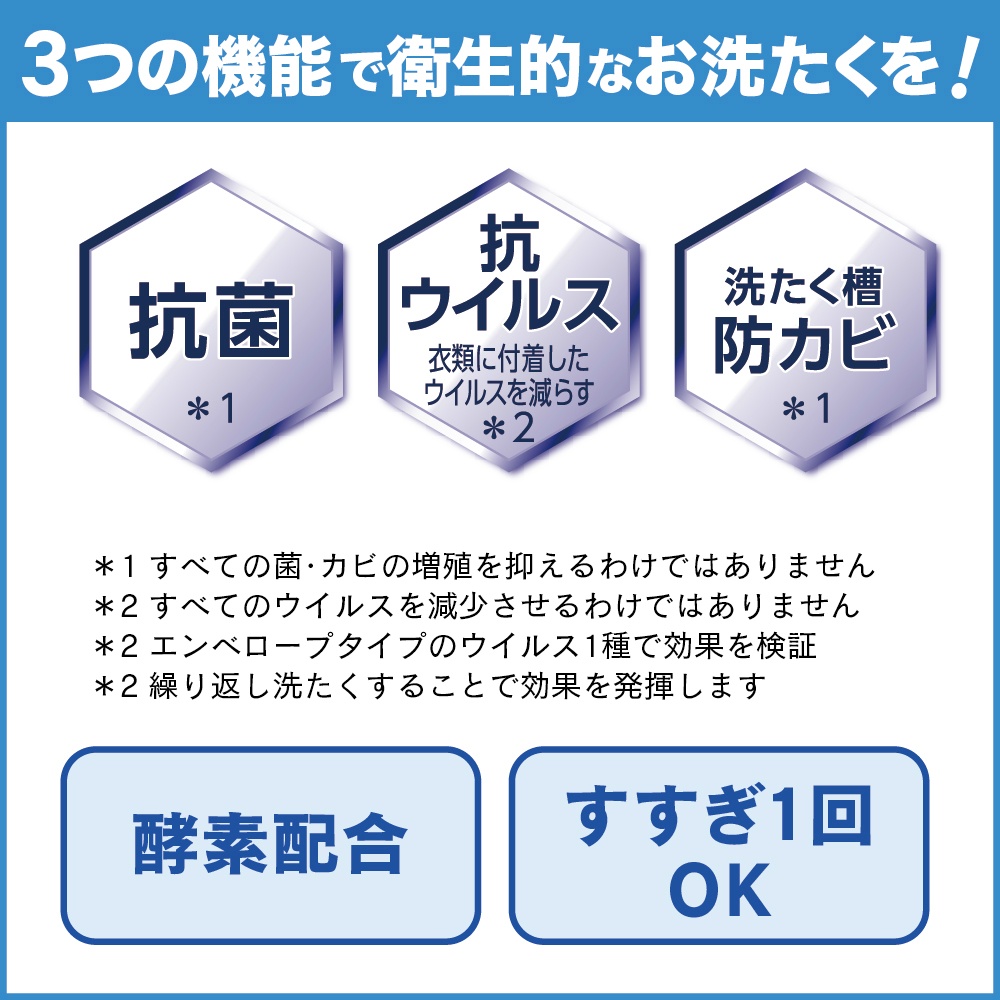 〔洗たく用洗剤〕●油、ドリップ、皮脂もスッキリ!●抗菌 ●抗ウイルス ●洗たく槽防カビ ●すすぎ1回