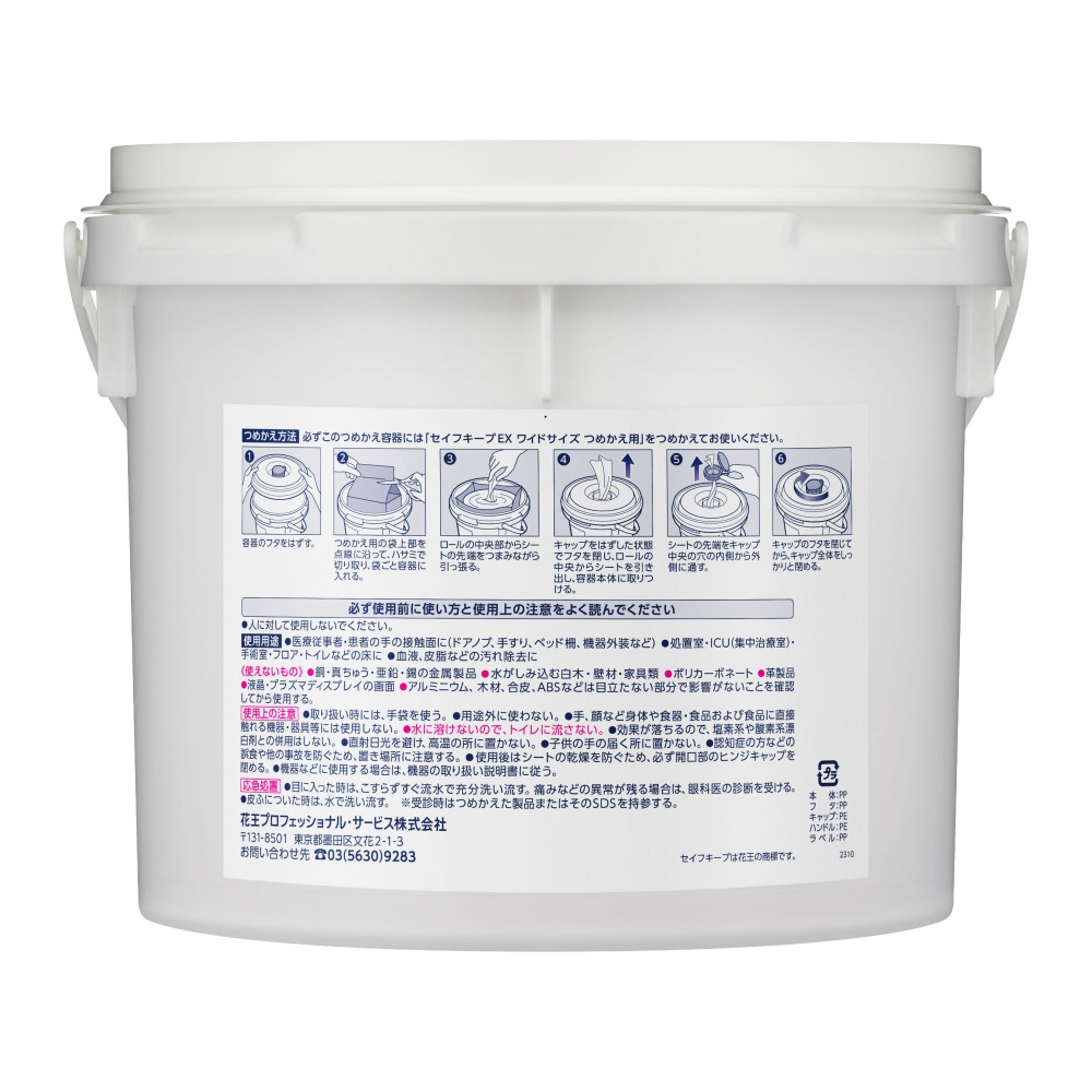 | 注意事項 | 〔使用上の注意〕 ●取り扱い時には、手袋を使う。 ●用途外に使わない。 ●手、顔など身体や食器・食品および食品に直接触れる機器・器具等には使用しない。 ●水に溶けないので、トイレに流さない。 ●効果が落ちるので、塩素系や酸素系漂白剤との併用はしない。 ●直射日光を避け、高温の所に置かない。 ●子供の手の届く所に置かない。 ●認知症の方などの誤食や他の事故を防ぐため、置き場所に注意する。 ●使用後はシートの乾燥を防ぐため、必ず開口部のヒンジキャップを閉める。 ●機器などに使用する場合は、機器の取り扱い説明書に従う。 〔応急処置〕 ●目に入った時は、こすらずすぐ流水で充分洗い流す。痛みなどの異常が残る場合は、眼科医の診断を受ける。 ●皮ふについた時は、水で洗い流す。 ※受診時はつめかえた製品またはそのSDSを持参する。 【使用方法用途など】〔つめかえ方法〕 必ずこのつめかえ容器には「セイフキープEX ワイドサイズ つめかえ用」をつめかえてお使いください。 1.容器のフタをはずす。 2.つめかえ用の袋上部を点線に沿って、ハサミで切り取り、袋ごと容器に入れる。 3.ロールの中央部からシートの先端をつまみながら引っ張る。 4.キャップをはずした状態でフタを閉じ、ロールの中央からシートを引き出し、容器本体に取りつける。 5.シートの先端をキャップ中央の穴の内側から外側に通す。 6.キャップのフタを閉じてから、キャップ全体をしっかりと閉める。 《使えないもの》 ●銅・真ちゅう・亜鉛・錫の金属製品 ●水がしみ込む白木・壁材・家具類 ●ポリカーボネート ●革製品 ●液晶・プラズマディスプレイの画面 ●アルミニウム、木材、合皮、ABSなどは目立たない部分で影響がないことを確認してから使用する。 【使用上の注意】〔使用上の注意〕 ●取り扱い時には、手袋を使う。 ●用途外に使わない。 ●手、顔など身体や食器・食品および食品に直接触れる機器・器具等には使用しない。 ●水に溶けないので、トイレに流さない。 ●効果が落ちるので、塩素系や酸素系漂白剤との併用はしない。 ●直射日光を避け、高温の所に置かない。 ●子供の手の届く所に置かない。 ●認知症の方などの誤食や他の事故を防ぐため、置き場所に注意する。 ●使用後はシートの乾燥を防ぐため、必ず開口部のヒンジキャップを閉める。 ●機器などに使用する場合は、機器の取り扱い説明書に従う。 〔応急処置〕 ●目に入った時は、こすらずすぐ流水で充分洗い流す。痛みなどの異常が残る場合は、眼科医の診断を受ける。 ●皮ふについた時は、水で洗い流す。 ※受診時はつめかえた製品またはそのSDSを持参する。 【保管保存方法】●直射日光を避け、高温の所に置かない。 ●子供の手の届く所に置かない。 ●認知症の方などの誤食や他の事故を防ぐため、置き場所に注意する。 ●使用後はシートの乾燥を防ぐため、必ず開口部のヒンジキャップを閉める。 |