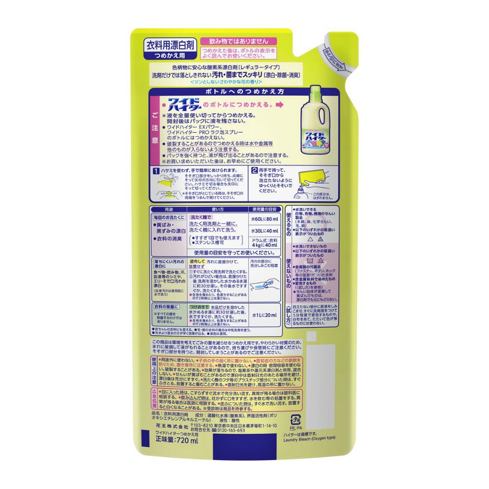 | 注意事項 | ボトルへのつめかえ方\nご注意\n●ワイドハイター EXパワー、ワイドハイター PRO ラク泡スプレーのボトルにはつめかえない。\n●破裂することがあるのでつめかえる時は水や金属等他のものが入らないよう注意する。 \n●パックを強く持つと、液が飛び出ることがあるので注意する。\n※お買い求めいただいた後は、お早めにご使用ください。\n\n使用上の注意\n●用途外に使わない。\n●子供の手の届く所に置かない。\n●認知症の方などの誤飲を防ぐため、置き場所に注意する。\n●熱湯で使わない。\n●漂白の時 密閉容器を使わない。破裂することがある。\n●効果が落ちるので、塩素系や還元系漂白剤と併用、混合しない。\n●せんいが黄ばむことがあるので漂白中は直射日光のあたる場所を避け、漂白後は充分にすすぐ。\n●洗たく機のフタ等のプラスチック部分についた時は、すぐふきとる。放置すると傷むことがある。\n●直射日光を避け、高温の所に置かない。 【使用方法用途など】つめかえ用\nワイドハイターのボトルにつめかえてください。\n\n用途\n使い方\n使用量の目安\n\n毎回のお洗たくに\n●黄ばみ・黒ずみの漂白\n●衣料の消臭\n\n洗たく機で\n洗たく用洗剤と一緒に、洗たく機に入れて洗う。\n●すすぎ1回でも使えます\n●ステンレス槽可\n\n水60Lに80ml\n水30Lに40ml\nドラム式:衣料4kgに40ml\n\n使用量の目安を守ってお使いください。\n\n落ちにくい汚れの漂白に\n食べ物・飲み物、汗、血液等のシミや、エリ・そで口汚れの漂白(血液汚れは使用前に水で洗う)\n\n塗布して\n汚れに直接かけて、放置せず \n●すぐに洗たく用洗剤で洗たくする。 \n●汚れがひどい場合は、直接かけた後洗剤を溶かした水かぬるま湯に約30分浸し、その後水ですすぐか、洗たくする。\n●生地を傷めたり、色落ちすることがあるので2時間以上は浸さない。\n\n汚れの部分に充分しみこむ程度\n\n衣料の除菌に\n※すべての菌を除菌するわけではありません。\n\nつけおきで\n本品だけを溶かした水かぬるま湯に約30分浸した後、水ですすぐか、洗たくする。\n●生地を傷めたり、色落ちすることがあるので2時間以上は浸さない。\n\n水1Lに20ml 【使用上の注意】ボトルへのつめかえ方\nご注意\n●ワイドハイター EXパワー、ワイドハイター PRO ラク泡スプレーのボトルにはつめかえない。\n●破裂することがあるのでつめかえる時は水や金属等他のものが入らないよう注意する。 \n●パックを強く持つと、液が飛び出ることがあるので注意する。\n※お買い求めいただいた後は、お早めにご使用ください。\n\n使用上の注意\n●用途外に使わない。\n●子供の手の届く所に置かない。\n●認知症の方などの誤飲を防ぐため、置き場所に注意する。\n●熱湯で使わない。\n●漂白の時 密閉容器を使わない。破裂することがある。\n●効果が落ちるので、塩素系や還元系漂白剤と併用、混合しない。\n●せんいが黄ばむことがあるので漂白中は直射日光のあたる場所を避け、漂白後は充分にすすぐ。\n●洗たく機のフタ等のプラスチック部分についた時は、すぐふきとる。放置すると傷むことがある。\n●直射日光を避け、高温の所に置かない。 【保管保存方法】●子供の手の届く所に置かない。\n●認知症の方などの誤飲を防ぐため、置き場所に注意する。\n●直射日光を避け、高温の所に置かない。 |