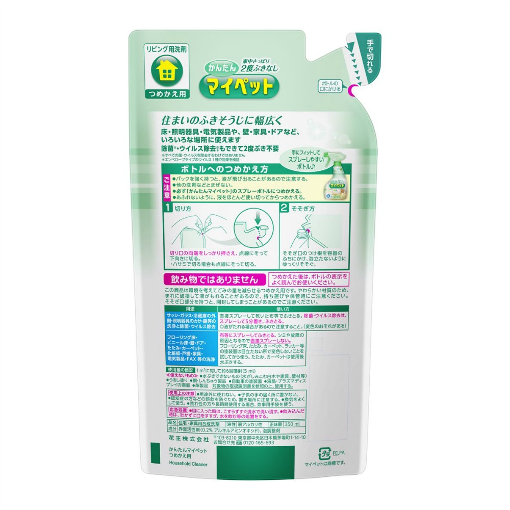 | 注意事項 | ボトルへのつめかえ方\nご注意\n●パックを強く持つと、液が飛び出ることがあるので注意する。\n●他の洗剤などとまぜない。\n●必ず「かんたんマイペット」のスプレーボトルにつめかえる。\n●あふれないように、液をほとんど使い切ってからつめかえる。\n\n使用上の注意\n●用途外に使わない。 \n●子供の手の届く所に置かない。\n●認知症の方などの誤飲を防ぐため、置き場所に注意する。\n●換気をよくして使う。\n●荒れ性の方や長時間使用する場合、炊事用手袋を使う。 【使用方法用途など】サッシ・ガラス・冷蔵庫の外側・照明器具のカサ・鏡等の洗浄と除菌・ウイルス除去\n\n直接スプレーして乾いた布等でふきとる。除菌・ウイルス除去は、スプレーして5分置き、ふきとる。\n◎液がたれる場合があるので注意すること。(変色のおそれがある)\nフローリング床・ビニール床・壁・ドア・たたみ・カーペット・化粧板・戸棚・家具・電気製品・FAX 等の洗浄\n\n布等にスプレーしてふきとる。シミや故障の原因となるので直接スプレーしない。フローリング床、たたみ、カーペット、ラッカー等の塗装面は目立たない所で変色しないことを試してから使う。たたみ、カーペットは使用後水ぶきする。\n\n泡の広がり方広い泡せまい泡\n\n使用量の目安 1m2に対して約6回噴射(5 ml)\n\n《使えないもの》 ●水ぶきできないもの(水がしみこむ白木や家具、壁材等) ●うるし塗り ●銅・しんちゅう製品 ●自動車の塗装面 ●液晶・プラズマディスプレイの画面 ●革製品\n対象物の取扱説明書を参照の上、使用する。\n★このスプレー容器は「かんたんマイペット」専用。 【使用上の注意】ボトルへのつめかえ方\nご注意\n●パックを強く持つと、液が飛び出ることがあるので注意する。\n●他の洗剤などとまぜない。\n●必ず「かんたんマイペット」のスプレーボトルにつめかえる。\n●あふれないように、液をほとんど使い切ってからつめかえる。\n\n使用上の注意\n●用途外に使わない。 \n●子供の手の届く所に置かない。\n●認知症の方などの誤飲を防ぐため、置き場所に注意する。\n●換気をよくして使う。\n●荒れ性の方や長時間使用する場合、炊事用手袋を使う。 【保管保存方法】●子供の手の届く所に置かない。●認知症の方等の誤飲を防ぐため、置き場所に注意する。 |