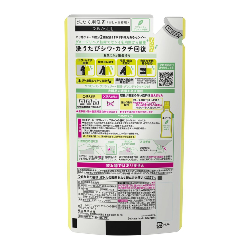 | 注意事項 | つめかえ方\nご注意\n●「エマール(リフレッシュグリーンの香り)」のボトルにつめかえる。\n●従来のボトルにつめかえる場合は、必ず中身が空になるまで使い切ってからつめかえる。\n●他の洗剤とまぜると、液が濁ったり、分離することがある。\n●自動投入機能付き洗たく機のおしゃれ着用洗剤対応タンクを使う場合は、洗たく機の取扱説明書に従う\n●お問合せの際に必要な場合があるため、このパックを保管する。\nパックを強く持つと、液が飛び出ることがあるので注意する。\n\n使用上の注意\n●用途外に使わない。\n●子供の手の届く所に置かない。\n●認知症の方等の誤飲を防ぐため、 置き場所に注意する。\n●使用後は手をよく洗う。\n●荒れ性の方や原液で使う場合は炊事用手袋を使う。\n●原液が洗たく機のフタ等についた時はすぐに水でふきとる。放置すると傷むことがある。 【使用方法用途など】お洗たく方法\n\n洗たく機\n【コース設定*2】をして洗う\n*2おうちクリーニング/\nおしゃれ着/ドライ/手洗い\nなどのやさしく洗えるコース\n\n手洗い\n1 やさしく押し洗い\n2 軽く脱水\n3 2回水をかえてすすぐ\n4 軽く脱水 ※脱水は1分以内\n●脱水後はすぐに取り出し、形を整えて干す●柔軟剤・液体酸素系漂白剤も使えます ●すすぎは2回をおすすめします 【使用上の注意】つめかえ方\nご注意\n●「エマール(リフレッシュグリーンの香り)」のボトルにつめかえる。\n●従来のボトルにつめかえる場合は、必ず中身が空になるまで使い切ってからつめかえる。\n●他の洗剤とまぜると、液が濁ったり、分離することがある。\n●自動投入機能付き洗たく機のおしゃれ着用洗剤対応タンクを使う場合は、洗たく機の取扱説明書に従う\n●お問合せの際に必要な場合があるため、このパックを保管する。\nパックを強く持つと、液が飛び出ることがあるので注意する。\n\n使用上の注意\n●用途外に使わない。\n●子供の手の届く所に置かない。\n●認知症の方等の誤飲を防ぐため、 置き場所に注意する。\n●使用後は手をよく洗う。\n●荒れ性の方や原液で使う場合は炊事用手袋を使う。\n●原液が洗たく機のフタ等についた時はすぐに水でふきとる。放置すると傷むことがある。 【保管保存方法】●子供の手の届く所に置かない。●認知症の方等の誤飲を防ぐため、置き場所に注意する。 |