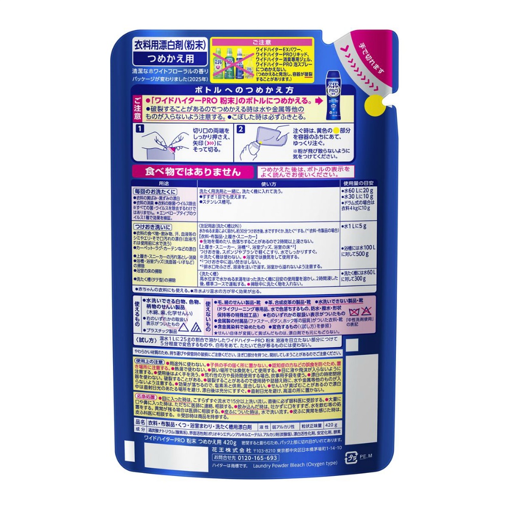 | 注意事項 | ご注意\nワイドハイターEXパワー、ワイドハイターPROリキッド、ワイドハイター 消臭専用ジェル、ワイドハイターPRO 泡スプレーにつめかえない。\n(つめかえると発泡し、容器が破裂することがあります。)\n\nボトルへのつめかえ方\nご注意\n●「ワイドハイターPRO 粉末」のボトルにつめかえる。\n●破裂することがあるのでつめかえる時は水や金属等他のものが入らないよう注意する。\n●こぼした時は必ずふきとる。\n\n使用上の注意\n●用途外に使わない。\n●子供の手の届く所に置かない。\n●認知症の方などの誤食を防ぐため、置き場所に注意する。\n●熱湯で使わない。\n●狭い場所では換気をして使用する。\n●目に液や飛沫が入らないように注意する。\n●使用後はよく手を洗う。\n●荒れ性の方や長時間使用する場合、炊事用手袋を使う。\n●漂白の時密閉容器を使わない。破裂することがある。\n●破裂することがあるので使用時や詰替え時に、水や金属等他のものが入らないよう注意する。\n●効果が落ちるので、塩素系と併用、混合しない。\n●せんいが黄ばむことがあるので漂白中は直射日光のあたる場所を避け、漂白後は充分にすすぐ。\n●直射日光を避け、高温の所に置かない。 【使用方法用途など】●「ワイドハイターPRO 粉末」のボトルにつめかえる。\n用途\n使い方\n使用量の目安\n\n毎回のお洗たくに\n●衣料の黄ばみ・黒ずみの漂白 \n●衣料の消臭 \n●衣料の除菌・ウイルス除去\n※すべての菌・ウイルスを除去するわけではありません。\n*エンベロープタイプのウイルス1種で効果を検証。\n\n洗たく用洗剤と一緒に、洗たく機に入れて洗う。\n●すすぎ1回でも使えます。 \n●ステンレス槽可。\n\n●水60Lに20g\n●水30Lに10g \n●ドラム式の場合は衣料4kgに10g\n\nつけおき洗いに\n●衣料の食べ物・飲み物、汗、血液等のシミやエリ・そで口汚れの漂白(血液汚れは使用前に水で洗う)\n●カーペット・ラグ・カーテンなどの漂白\n●上履き・スニーカーの汚れ落とし・消臭\n●浴槽・浴室グッズ(洗面器・いすなど)の掃除\n●浴室の床の掃除\n●洗たく槽(タテ型)の掃除\n\n〈左記用途(洗たく槽以外)〉\n水かぬるま湯によく溶かし約30分つけおき後、水ですすぐか、洗たく*1する。(*1衣料・布製品の場合)\n\n【衣料・布製品・上履き・スニーカー】\n●生地を傷めたり、色落ちすることがあるので2時間以上浸さない。\n【上履き・スニーカー、浴槽*2、浴室グッズ、浴室の床*3】\nつけおき後、スポンジやブラシで軽くこすり、水でしっかりすすぐ。\n ※洗たく機は使わない。\n●浴室では換気をして使用する。\n*2つけおき中に追い焚きはしない。\n*3排水口をふさぎ、溶液を注いで浸す。浴室から溢れないよう注意する。\n\n●水1Lに5g\n●浴槽には水100Lに対して500g\n\n〈洗たく槽〉\n高水位まで水かぬるま湯をはった洗たく機に目安の使用量を溶かし、2時間浸した\n後、標準コースで運転する。 ●掃除中に洗たく物を入れない。\n\n●洗たく槽には水60Lに対して300g 【使用上の注意】ご注意\nワイドハイターEXパワー、ワイドハイターPROリキッド、ワイドハイター 消臭専用ジェル、ワイドハイターPRO 泡スプレーにつめかえない。\n(つめかえると発泡し、容器が破裂することがあります。)\n\nボトルへのつめかえ方\nご注意\n●「ワイドハイターPRO 粉末」のボトルにつめかえる。\n●破裂することがあるのでつめかえる時は水や金属等他のものが入らないよう注意する。\n●こぼした時は必ずふきとる。\n\n使用上の注意\n●用途外に使わない。\n●子供の手の届く所に置かない。\n●認知症の方などの誤食を防ぐため、置き場所に注意する。\n●熱湯で使わない。\n●狭い場所では換気をして使用する。\n●目に液や飛沫が入らないように注意する。\n●使用後はよく手を洗う。\n●荒れ性の方や長時間使用する場合、炊事用手袋を使う。\n●漂白の時密閉容器を使わない。破裂することがある。\n●破裂することがあるので使用時や詰替え時に、水や金属等他のものが入らないよう注意する。\n●効果が落ちるので、塩素系と併用、混合しない。\n●せんいが黄ばむことがあるので漂白中は直射日光のあたる場所を避け、漂白後は充分にすすぐ。\n●直射日光を避け、高温の所に置かない。 【保管保存方法】●子供の手の届く所に置かない。\n●認知症の方などの誤飲を防ぐため、置き場所に注意する。\n●直射日光を避け、高温の所に置かない。 |