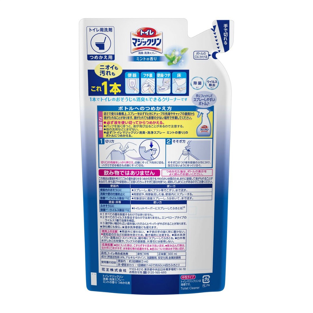 | 注意事項 | ボトルへのつめかえ方\nご注意\n逆さで使える機構上、スプレーをはずすときにチューブの先端やキャップの裏側から液がたれることがあります。\n液がたれても影響の少ない場所で作業してください。\n●必ず液を使い切ってからつめかえる。\n●パックを強く持つと、液が飛び出ることがあるので注意する。\n●他の洗剤などとまぜない。\n●必ず「トイレマジックリン消臭・洗浄スプレー ミントの香り」のボトルにつめかえる。\n\n使用上の注意\n●用途外に使わない。 \n●子供の手の届く所に置かない。\n●認知症の方などの誤飲を防ぐため、置き場所に注意する。 \n●温水洗浄ノズル・温風出口・スイッチには、雑巾等にスプレーしてふきとる。\n●白木等水がしみこむ材質や、ワックスの塗装面、大理石には使用しない。 【使用方法用途など】●必ず「トイレマジックリン消臭・洗浄スプレー ミントの香り」のボトルにつめかえる。\n便利なスプレーの使い方\nフチ裏まで届く逆さスプレー\n泡の広がり方\n広い泡ペーパーなどにしみこませやすく、ふきそうじにおすすめ\nせまい泡便器内\n\n使い方便器内のおそうじに\n●スプレーし、軽くブラシ等でこすり、水で流す。消臭や便の付着防止に\n●用便前や、用便後流した後、便器内にスプレーする。除菌※1・ウイルス除去※2に\n●対象部分に直接スプレーし、5分おいて、水で流す。\n便座・床等\n使い方\nふきそうじに除菌※1・ウイルス除去※2に\n●トイレットペーパーにスプレーしてふきとる。※3\n※1:すべての菌を除菌するわけではありません。\n※2:すべてのウイルスを除去するわけではありません。エンベロープタイプのウイルス1種で効果を検証。\n※3:液が多い場合や、広い面を強い力でふくとペーパーがやぶれることがあります。 【使用上の注意】ボトルへのつめかえ方\nご注意\n逆さで使える機構上、スプレーをはずすときにチューブの先端やキャップの裏側から液がたれることがあります。\n液がたれても影響の少ない場所で作業してください。\n●必ず液を使い切ってからつめかえる。\n●パックを強く持つと、液が飛び出ることがあるので注意する。\n●他の洗剤などとまぜない。\n●必ず「トイレマジックリン消臭・洗浄スプレー ミントの香り」のボトルにつめかえる。\n\n使用上の注意\n●用途外に使わない。 \n●子供の手の届く所に置かない。\n●認知症の方などの誤飲を防ぐため、置き場所に注意する。 \n●温水洗浄ノズル・温風出口・スイッチには、雑巾等にスプレーしてふきとる。\n●白木等水がしみこむ材質や、ワックスの塗装面、大理石には使用しない。 【保管保存方法】●子供の手の届く所に置かない。●認知症の方等の誤飲を防ぐため、置き場所に注意する。 |