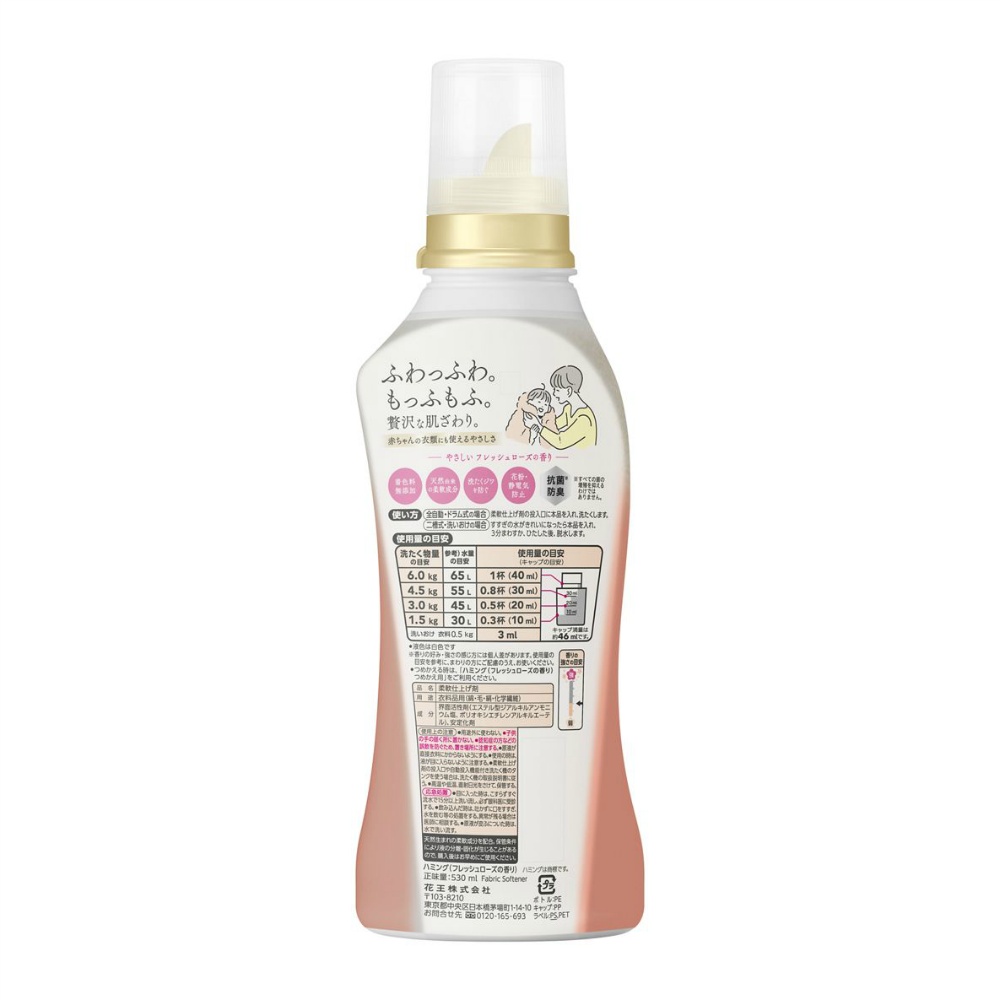 ふわもふぜいたくな肌ざわり・ハミングNo.1のやわらかさ。フレッシュローズの香り。衣類のチクチク、ごわごわのプチストレスを解消。ほっと安心、思わず顔をうずめたくなる仕上がりへ。赤ちゃんの衣類にも使える。着色料無添加。天然由来の柔軟成分配合。