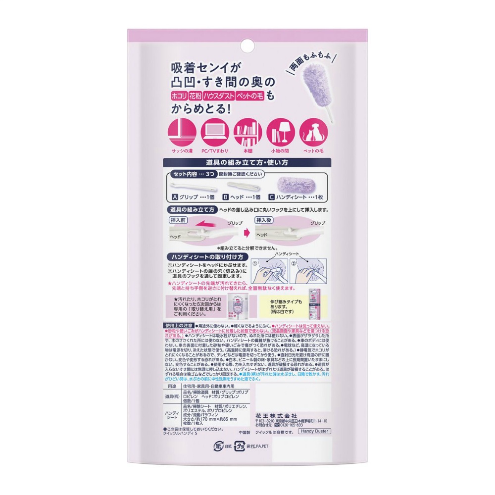 | 注意事項 | 使用上の注意\n●用途外に使わない。\n●軽くなでるようにふく。\n●ハンディシートは洗って使えない。\n●砂粒や硬いごみがハンディシートに付着した状態で使わない。(液晶画面や家具などを傷つける恐れがある。)\n●ハンディシートは吸水性がないので、ぬれた所には使わない。\n●表面がザラザラした所や、木のささくれた所には使わない。ハンディシートの繊維が抜けることがある。\n●車のボディには使わない。車の表面に付着した砂粒や硬いごみで傷がつく恐れがある。\n●電球など、高温になっている物は電源を切り、冷えた状態で使う。(高温時に使用すると、溶ける恐れがある。)\n●静電気でホコリがとれにくくなることがあるので、テレビなどは電源を切ってから使う。\n●直射日光を避け高温の所に置かない。変色や変形する恐れがある。\n●白木、ビニール製の床・家具などの上に長期間置いたままにしない。変色することがある。\n●使用する際、力を入れすぎない。道具が破損する恐れがある。\n●道具が入らないすき間には無理に押し込まない。ハンディシートがはずれたり道具が破損することがある。はずれる場合は輪ゴムなどでしっかり固定する。\n●道具(柄)が汚れた時は水ぶきし、日陰で乾かす。汚れがひどい時は、水ぶきの前に中性洗剤をうすめた液でふく。 【使用方法用途など】道具の組み立て方\nヘッドの差し込み口に丸いフックを上にして挿入します。\n*組み立てると分解できません。\n\nハンディシートの取り付け方\n●ハンディシートをヘッドにかぶせます。\n●ハンディシートの端の穴(切込み)に道具のフックを通して固定します。\n★ハンディシートの先端が汚れてきたら、先端と持ち手側を逆さに付け替えれば、全面無駄なく使えます。 【使用上の注意】使用上の注意\n●用途外に使わない。\n●軽くなでるようにふく。\n●ハンディシートは洗って使えない。\n●砂粒や硬いごみがハンディシートに付着した状態で使わない。(液晶画面や家具などを傷つける恐れがある。)\n●ハンディシートは吸水性がないので、ぬれた所には使わない。\n●表面がザラザラした所や、木のささくれた所には使わない。ハンディシートの繊維が抜けることがある。\n●車のボディには使わない。車の表面に付着した砂粒や硬いごみで傷がつく恐れがある。\n●電球など、高温になっている物は電源を切り、冷えた状態で使う。(高温時に使用すると、溶ける恐れがある。)\n●静電気でホコリがとれにくくなることがあるので、テレビなどは電源を切ってから使う。\n●直射日光を避け高温の所に置かない。変色や変形する恐れがある。\n●白木、ビニール製の床・家具などの上に長期間置いたままにしない。変色することがある。\n●使用する際、力を入れすぎない。道具が破損する恐れがある。\n●道具が入らないすき間には無理に押し込まない。ハンディシートがはずれたり道具が破損することがある。はずれる場合は輪ゴムなどでしっかり固定する。\n●道具(柄)が汚れた時は水ぶきし、日陰で乾かす。汚れがひどい時は、水ぶきの前に中性洗剤をうすめた液でふく。 【保管保存方法】●直射日光を避け高温の所に置かない。変色や変形する恐れがある。\n●白木、ビニール製の床・家具などの上に長期間置いたままにしない。変色することがある。 |