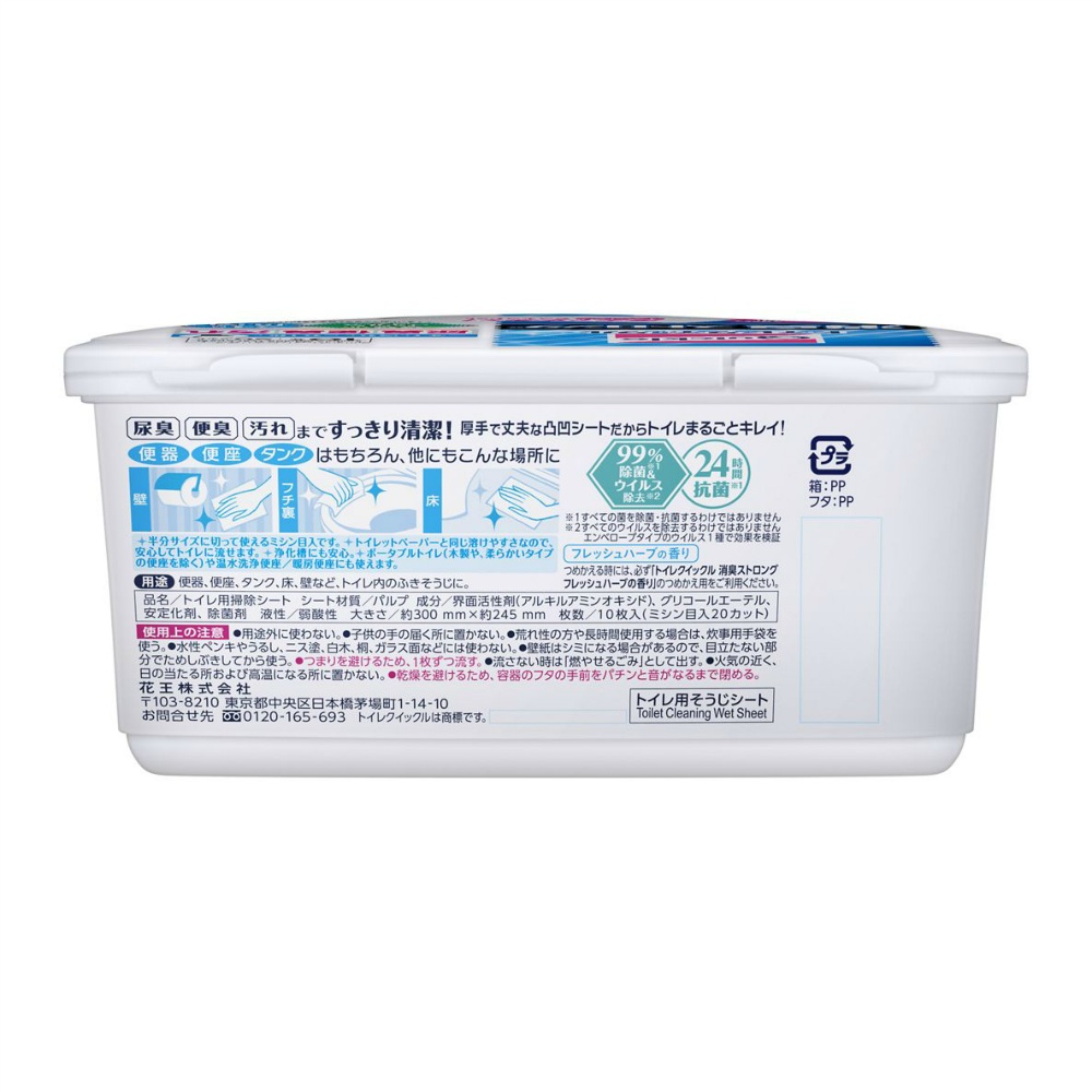 | 注意事項 | 使用上の注意\n●用途外に使わない。\n●子供の手の届く所に置かない。\n●荒れ性の方や長時間使用する場合は、炊事用手袋を使う。\n●水性ペンキやうるし、ニス塗、白木、桐、ガラス面などには使わない。\n●壁紙はシミになる場合があるので、目立たない部分でためしぶきしてから使う。\n●つまりを避けるため、1枚ずつ流す。\n●流さない時は「燃やせるごみ」として出す。\n●火気の近く、日の当たる所および高温になる所に置かない。\n●乾燥を避けるため、容器のフタの手前をパチンと音がなるまで閉める。 【使用方法用途など】尿臭 便臭 汚れまですっきり清潔!厚手で丈夫な凸凹シートだからトイレまるごとキレイ\n便器 便座 タンクはもちろん、他にもこんな場所に 壁/フチ裏/床\n\n半分サイズに切って使えるミシン目入です。 \nトイレットペーパーと同じ溶けやすさなので、\n安心してトイレに流せます。\n浄化槽にも安心。\nポータブルトイレ(木製や、柔らかいタイプの便座を除く)や温水洗浄便座/暖房便座にも使えます。 \n99%除菌※1&\nウイルス除去※2\n24時間抗菌※1\n※1すべての菌を除菌・抗菌するわけではありません\n※2すべてのウイルスを除去するわけではありません\nエンベロープタイプのウイルス1種で効果を検証\nフレッシュハーブの香り\nつめかえる時には、必ず「トイレクイックル 消臭ストロングフレッシュハーブの香り」 のつめかえ用をご利用ください。\n用途 便器、便座、タンク、床、壁など、トイレ内のふきそうじに。 【使用上の注意】使用上の注意\n●用途外に使わない。\n●子供の手の届く所に置かない。\n●荒れ性の方や長時間使用する場合は、炊事用手袋を使う。\n●水性ペンキやうるし、ニス塗、白木、桐、ガラス面などには使わない。\n●壁紙はシミになる場合があるので、目立たない部分でためしぶきしてから使う。\n●つまりを避けるため、1枚ずつ流す。\n●流さない時は「燃やせるごみ」として出す。\n●火気の近く、日の当たる所および高温になる所に置かない。\n●乾燥を避けるため、容器のフタの手前をパチンと音がなるまで閉める。 【保管保存方法】●子供の手の届く所に置かない。●認知症の方等の誤飲を防ぐため、置き場所に注意する。 |