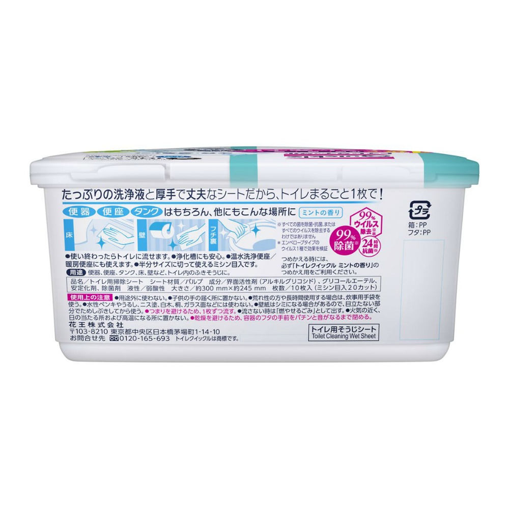 | 注意事項 | 使用上の注意\n●用途外に使わない。\n●子供の手の届く所に置かない。\n●荒れ性の方や長時間使用する場合は、炊事用手袋を使う。\n●水性ペンキやうるし、ニス塗、白木、桐、ガラス面などには使わない。\n●壁紙はシミになる場合があるので、目立たない部分でためしぶきしてから使う。\n●つまりを避けるため、1枚ずつ流す。\n●流さない時は「燃やせるごみ」として出す。\n●火気の近く、日の当たる所および高温になる所に置かない。\n●乾燥を避けるため、容器のフタの手前をパチンと音がなるまで閉める。 【使用方法用途など】たっぷりの洗浄液と厚手で丈夫なシートだから、トイレまるごと1枚で!\n\n便器 便座 タンク はもちろん、他にもこんな場所に 床/壁/フチ裏\n●使い終わったらトイレに流せます。\n●浄化槽にも安心。\n●温水洗浄便座/暖房便座にも使えます。\n●半分サイズに切って使えるミシン目入です。\n用途 便器、便座、タンク、床、壁など、トイレ内のふきそうじに。 【使用上の注意】使用上の注意\n●用途外に使わない。\n●子供の手の届く所に置かない。\n●荒れ性の方や長時間使用する場合は、炊事用手袋を使う。\n●水性ペンキやうるし、ニス塗、白木、桐、ガラス面などには使わない。\n●壁紙はシミになる場合があるので、目立たない部分でためしぶきしてから使う。\n●つまりを避けるため、1枚ずつ流す。\n●流さない時は「燃やせるごみ」として出す。\n●火気の近く、日の当たる所および高温になる所に置かない。\n●乾燥を避けるため、容器のフタの手前をパチンと音がなるまで閉める。 【保管保存方法】●子供の手の届く所に置かない。●認知症の方等の誤飲を防ぐため、置き場所に注意する。 |