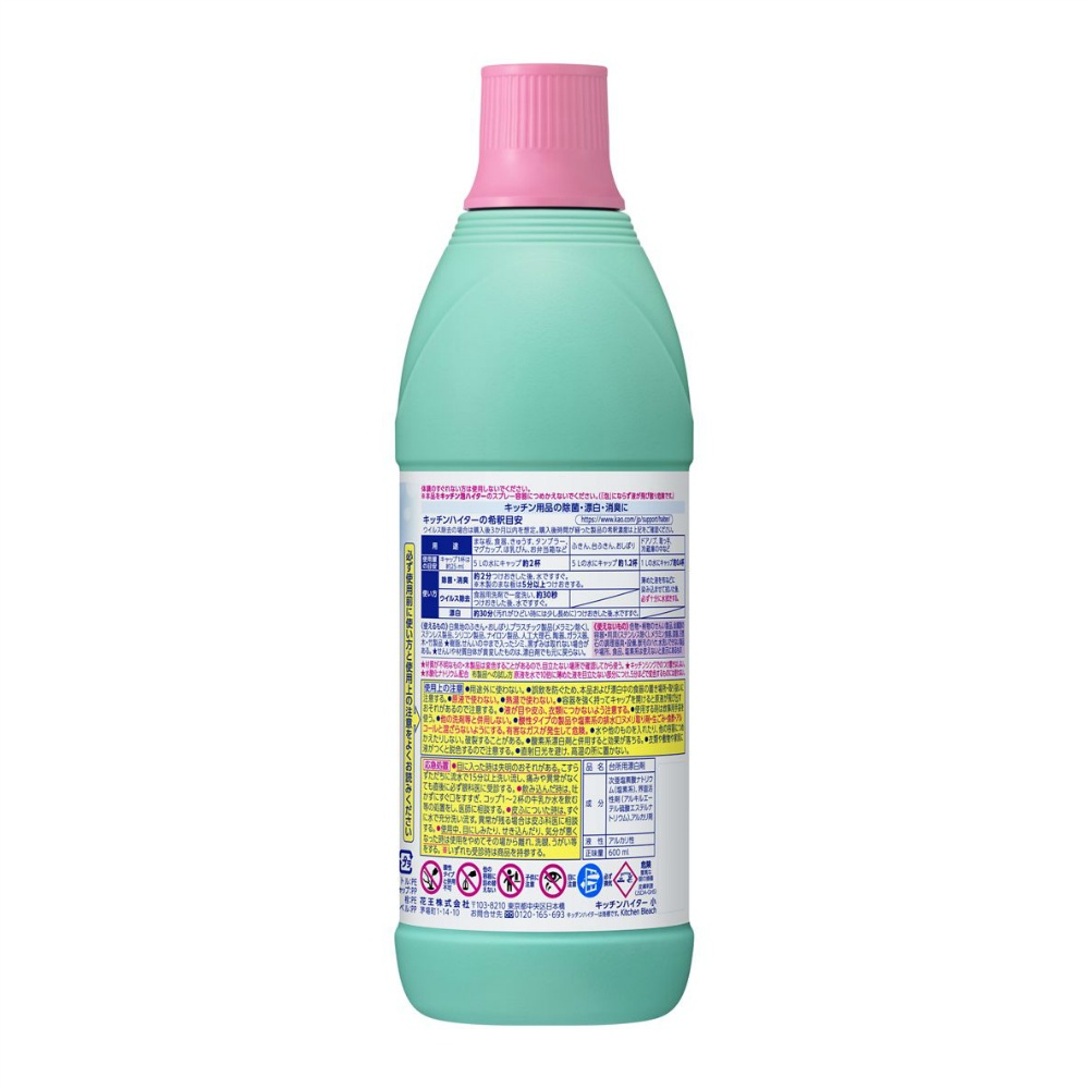 | 注意事項 | 必ず使用前に使い方と使用上の注意をよくお読みください。\n体調のすぐれない方は使用しないでください。\n※本品を[キッチン泡ハイター]のスプレー容器につめかえないでください。(「泡」にならず液が飛び散り危険です。)\n\n使用上の注意\n●用途外に使わない。\n●誤飲を防ぐため、本品および漂白中の食器の置き場所・取り扱いに注意する。\n●原液で使わない。\n●熱湯で使わない。\n●容器を強く持ってキャップを開けると原液が飛び出すおそれがあるので注意する。\n●液が目や皮ふ、衣類につかないよう注意する。\n●使用する時は炊事用手袋を使う。\n●他の洗剤等と併用しない。\n●酸性タイプの製品や塩素系の排水口ヌメリ取り剤・生ごみ・食酢・アルコールと混ざらないようにする。有害なガスが発生して危険。\n●水や他のものを入れたり、他の容器につめかえたりしない。破裂することがある。\n●酸素系漂白剤と併用すると効果が落ちる。\n●衣類や敷物や家具に液がつくと脱色するので注意する。\n●直射日光を避け、高温の所に置かない。\n\n塩素系\n●酸性タイプの製品と一緒に使う(まぜる)と有害な塩素ガスが出て危険。\n●液が目に入ったら、すぐ水で洗う。\n●子供の手にふれないようにする。\n●必ず換気をよくして使用する。 【使用方法用途など】キッチンハイターの希釈目安\nウイルス除去の場合は購入後3か月以内を想定。\n\n●まな板、食器、きゅうす、タンブラー、マグカップ、ほ乳びん、お弁当箱など\n【使用量の目安】5Lの水にキャップ 約2杯(キャップ1杯は約25ml)\n\n<除菌・消臭>\n 約2分つけおきした後、水ですすぐ。※木製のまな板は 5分以上つけおきする。\n\n<ウイルス除去>\n 食器用洗剤で一度洗い、約30秒つけおきした後、水ですすぐ。\n\n<漂白>\n 約30分(汚れがひどい時には少し長めに)つけおきした後、水ですすぐ。\n\n●ふきん、台ふきん、おしぼり\n【使用量の目安】5Lの水にキャップ 約1.2杯(キャップ1杯は約25ml)\n\n<除菌・消臭>\n 約2分つけおきした後、水ですすぐ。\n\n<漂白>\n 約30分(汚れがひどい時には少し長めに)つけおきした後、水ですすぐ。\n\n●ドアノブ、取っ手、冷蔵庫の中など\n【使用量の目安】1Lの水にキャップ 約0.4杯(キャップ1杯は約25ml)\n\n<除菌・消臭・ウイルス除去>\n 薄めた液を布などに染み込ませて拭いた後、必ず十分に水拭きする。 【使用上の注意】必ず使用前に使い方と使用上の注意をよくお読みください。\n体調のすぐれない方は使用しないでください。\n※本品を[キッチン泡ハイター]のスプレー容器につめかえないでください。(「泡」にならず液が飛び散り危険です。)\n\n使用上の注意\n●用途外に使わない。\n●誤飲を防ぐため、本品および漂白中の食器の置き場所・取り扱いに注意する。\n●原液で使わない。\n●熱湯で使わない。\n●容器を強く持ってキャップを開けると原液が飛び出すおそれがあるので注意する。\n●液が目や皮ふ、衣類につかないよう注意する。\n●使用する時は炊事用手袋を使う。\n●他の洗剤等と併用しない。\n●酸性タイプの製品や塩素系の排水口ヌメリ取り剤・生ごみ・食酢・アルコールと混ざらないようにする。有害なガスが発生して危険。\n●水や他のものを入れたり、他の容器につめかえたりしない。破裂することがある。\n●酸素系漂白剤と併用すると効果が落ちる。\n●衣類や敷物や家具に液がつくと脱色するので注意する。\n●直射日光を避け、高温の所に置かない。\n\n塩素系\n●酸性タイプの製品と一緒に使う(まぜる)と有害な塩素ガスが出て危険。\n●液が目に入ったら、すぐ水で洗う。\n●子供の手にふれないようにする。\n●必ず換気をよくして使用する。 【保管保存方法】●子供の手の届く所に置かない。\n●認知症の方などの誤飲を防ぐため、置き場所に注意する。\n●直射日光を避け、高温の所に置かない。 |