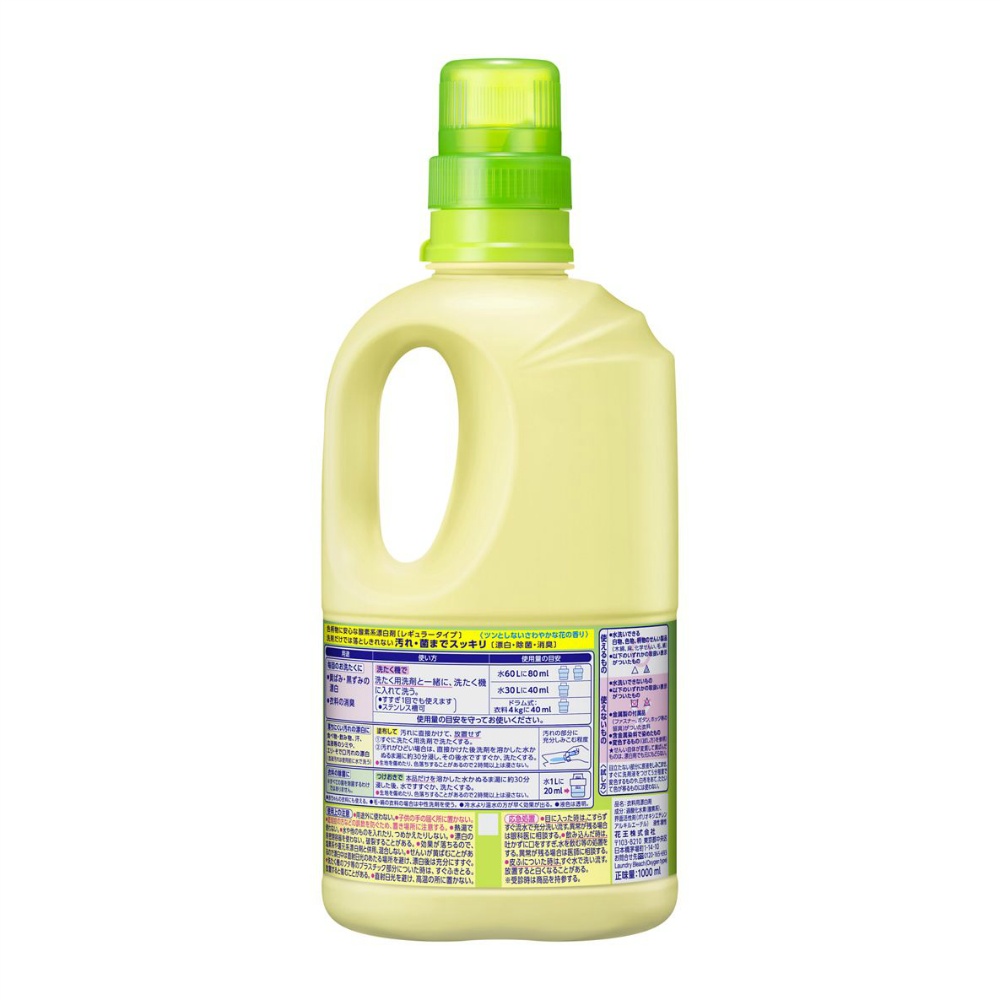 | 注意事項 | 使用上の注意\n●用途外に使わない。\n●子供の手の届く所に置かない。\n●認知症の方などの誤飲を防ぐため、置き場所に注意する。\n●熱湯で使わない。\n●水や他のものを入れたり、つめかえたりしない。\n●漂白の時密閉容器を使わない。破裂することがある。\n●効果が落ちるので、塩素系や還元系漂白剤と併用、混合しない。\n●せんいが黄ばむことがあるので漂白中は直射日光のあたる場所を避け、漂白後は充分にすすぐ。\n●洗たく機のフタ等のプラスチック部分についた時は、すぐふきとる。放置すると傷むことがある。\n●直射日光を避け、高温の所に置かない。 【使用方法用途など】用途\n使い方\n使用量の目安\n\n毎回のお洗たくに\n●黄ばみ・黒ずみの漂白\n●衣料の消臭\n\n洗たく機で\n洗たく用洗剤と一緒に、洗たく機に入れて洗う。\n●すすぎ1回でも使えます\n●ステンレス槽可\n\n水60Lに80ml\n水30Lに40ml\nドラム式:衣料4kgに40ml\n\n使用量の目安を守ってお使いください。\n\n落ちにくい汚れの漂白に\n食べ物・飲み物、汗、血液等のシミや、エリ・そで口汚れの漂白(血液汚れは使用前に水で洗う)\n\n塗布して\n汚れに直接かけて、放置せず \n●すぐに洗たく用洗剤で洗たくする。 \n●汚れがひどい場合は、直接かけた後洗剤を溶かした水かぬるま湯に約30分浸し、その後水ですすぐか、洗たくする。\n●生地を傷めたり、色落ちすることがあるので2時間以上は浸さない。\n\n汚れの部分に充分しみこむ程度\n\n衣料の除菌に\n※すべての菌を除菌するわけではありません。\n\nつけおきで\n本品だけを溶かした水かぬるま湯に約30分浸した後、水ですすぐか、洗たくする。\n●生地を傷めたり、色落ちすることがあるので2時間以上は浸さない。\n\n水1Lに20ml 【使用上の注意】使用上の注意\n●用途外に使わない。\n●子供の手の届く所に置かない。\n●認知症の方などの誤飲を防ぐため、置き場所に注意する。\n●熱湯で使わない。\n●水や他のものを入れたり、つめかえたりしない。\n●漂白の時密閉容器を使わない。破裂することがある。\n●効果が落ちるので、塩素系や還元系漂白剤と併用、混合しない。\n●せんいが黄ばむことがあるので漂白中は直射日光のあたる場所を避け、漂白後は充分にすすぐ。\n●洗たく機のフタ等のプラスチック部分についた時は、すぐふきとる。放置すると傷むことがある。\n●直射日光を避け、高温の所に置かない。 【保管保存方法】●子供の手の届く所に置かない。\n●認知症の方などの誤飲を防ぐため、置き場所に注意する。\n●直射日光を避け、高温の所に置かない。 |